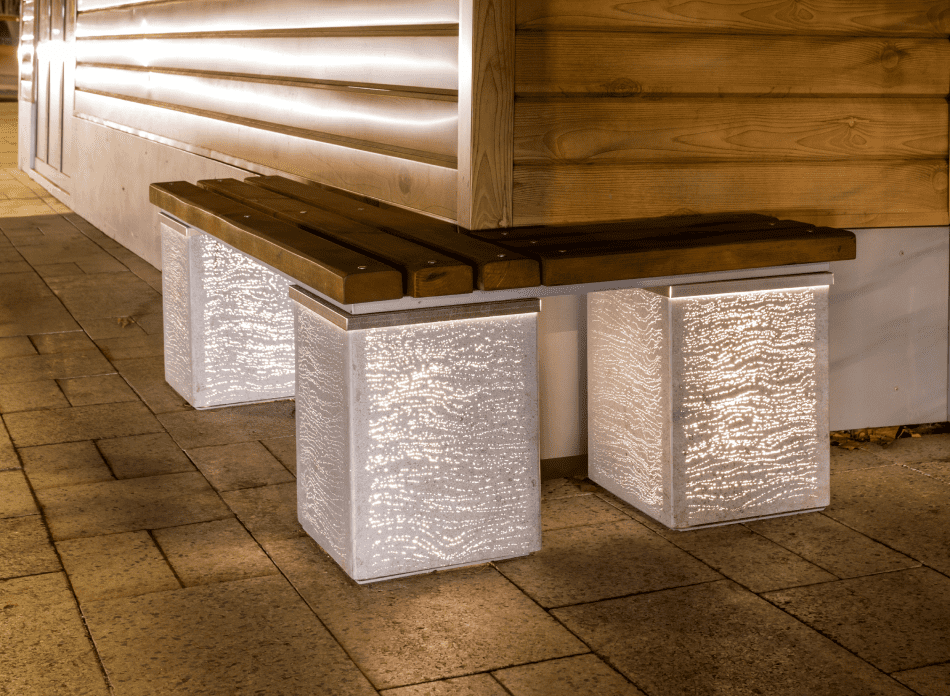 Изготавливается на основе высокопрочного цемента и мраморной крошки мелких фракций. Это надёжный и вандалоустойчивый материал, который в тёмное время суток превращается в стильные светильники.